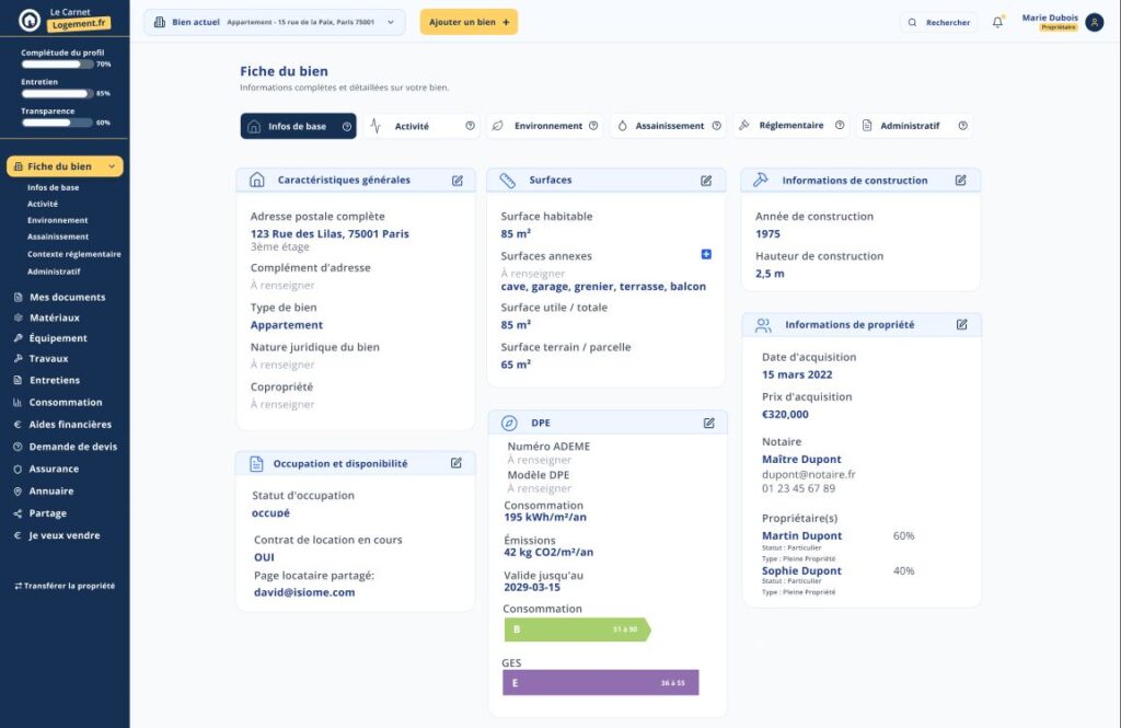 Centralisez tous les documents de votre bien, suivez les entretiens, partagez avec vos pros, vendez mieux.